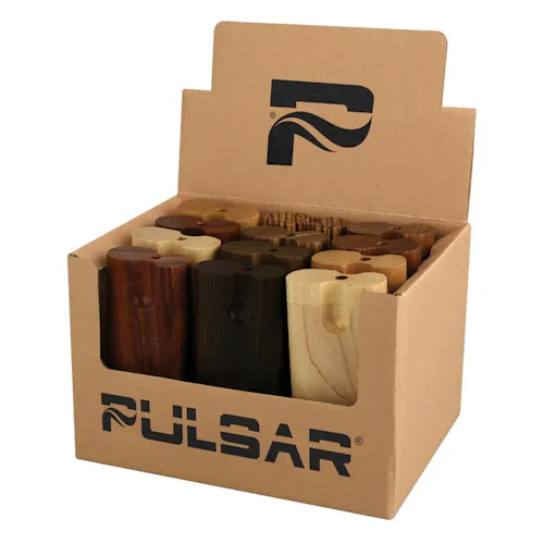 These Pulsar Wood Dugouts w/ Twist Tops are high quality dugouts that are made with mixed exotic woods including Pine, Rosewood and Maple. The lid has a twist top style opening. Inside features a spring-loaded taster bat slot, herbal storage and a metal poker tool. Also includes a taster bat. The 3.25 inch dugouts are laser engraved with the Pulsar logo.