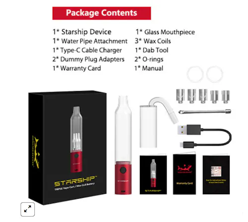Package: 1pc Starship Battery, 1pc Glass Mouthpiece, 1pc Water Pipe Attachment, 3pcs Wax Coils, 1pc Type-C Cable, 1pc Dab Tool, 2pcs O-rings, 2pcs Dummy Plugs, 1pc QR Card