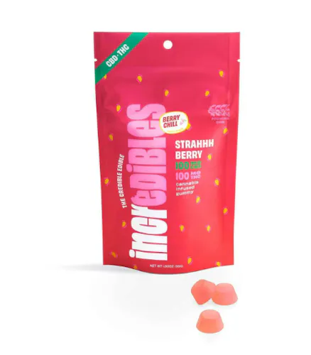 Berry chill. Sunshiney days, fresh-picked strawberries, and nothing on the agenda. Kick up your feet and say it with us, "ahhh." incredibles Strahhhberry CBD 1:1 gummies offer 100mg THC total and 100mg CBD, with 10mg THC and 10mg CBD per gummy. Made with 100% pure cannabis oil in a perfectly blended mixture to ensure accurate dosing and consistency.