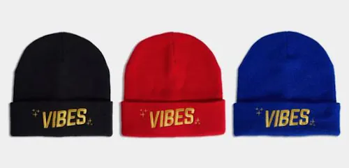 The Vibes™ Beanie sports a classic fold-over style and cozy fit. Supremely soft and comfortable, the beanie is embroidered with the golden Vibes logo and starry seal. To keep it in fresh condition during transport and travel, the Beanie comes packaged in a hygienic Vibes-branded plastic bag.