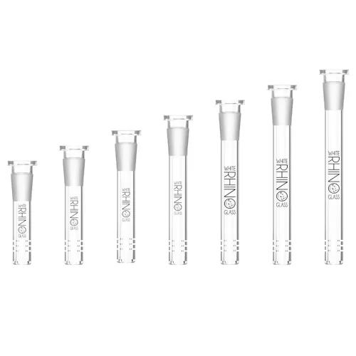 These White Rhino Glass Downstems are made of sturdy borosilicate glass, come in seven different sizes ranging from 3 inches to 6 inches long from tip to tip, and feature the White Rhino logo on clear glass. The downstems are designed to hold a 14mm male banger or herb slide.